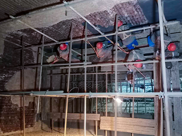 榮盛耐材施工人員正在施工 四川4x90循環(huán)流化床鍋爐內(nèi)襯維修現(xiàn)場 鍋爐內(nèi)襯不定形耐火材料施工效果 四川4x90循環(huán)流化床鍋爐···