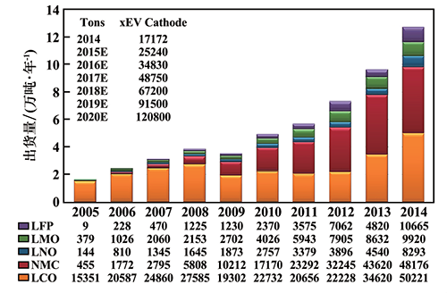 圖1 2005-2014年全球正極材料出貨量(EVTank統(tǒng)計)