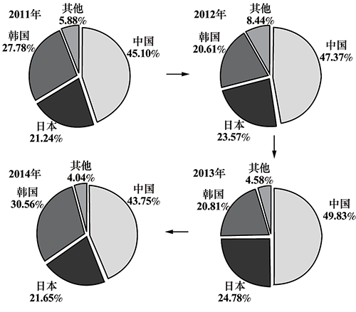 圖2 2011-2014年中日韓正極材料企業(yè)市場份額變化