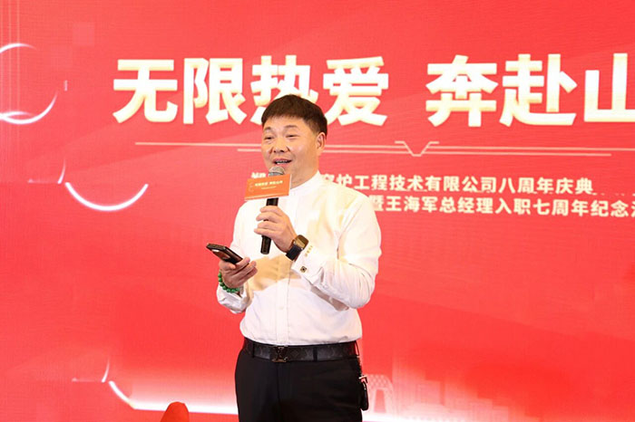 集團(tuán)董事長楚科奇首先發(fā)表了致辭。他回顧了榮盛窯爐工程八年來從創(chuàng)業(yè)維艱到行業(yè)頭部的奮斗歷程。他指出,每一份成績的取得,都凝聚著全體員工的智慧、汗水與“無限熱愛”。楚總向入職七周年的王海軍總經(jīng)理表達(dá)敬意與感謝,高度評(píng)價(jià),擁有 領(lǐng)導(dǎo)力和市場洞察力。他特別強(qiáng)調(diào),在王總的帶領(lǐng)下,工程公司今年業(yè)績超越預(yù)期,創(chuàng)下歷史新高,為公司樹立了新的發(fā)展標(biāo)桿。同時(shí),楚總也對(duì)朱廣州帶領(lǐng)的工程項(xiàng)目部、白建偉負(fù)責(zé)的生產(chǎn)部以及集團(tuán)管理層表達(dá)了充分肯定,感謝各團(tuán)隊(duì)為公司發(fā)展作出的重要貢獻(xiàn)。后,楚總號(hào)召全體榮盛人,以八周年為新的起跑線,憑借對(duì)事業(yè)的無限熱愛與堅(jiān)定信念,共同驅(qū)動(dòng)榮盛巨輪,在時(shí)代的浪潮中破浪前行,開辟更加壯麗的征途。