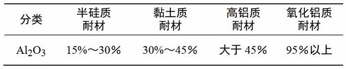 Al?O?-SiO?系耐火材料的基本化學組成是氧化鋁和二氧化硅,依照氧化鋁含量的高低,將硅鋁系耐火材料劃分為表1幾類。
