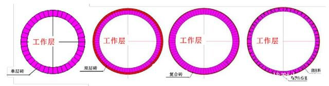 回轉(zhuǎn)窯焚燒爐非常關(guān)鍵設(shè)備即為回轉(zhuǎn)窯本體, 因其是一種動(dòng)態(tài)運(yùn)轉(zhuǎn)設(shè)備,對(duì)內(nèi)襯結(jié)構(gòu)設(shè)計(jì)要求較高,首先要確保耐火內(nèi)襯在動(dòng)態(tài)高溫狀態(tài)運(yùn)行下整體內(nèi)襯的穩(wěn)定性,防止耐火磚掉磚、抽簽等問(wèn)題。對(duì)于危廢回轉(zhuǎn)窯系統(tǒng)而言,由于轉(zhuǎn)速比較慢,一般在1轉(zhuǎn)/分以下,可以根據(jù)廠房設(shè)計(jì)和節(jié)能要求選擇單層磚、雙層磚、復(fù)合磚和整體澆注等不同結(jié)構(gòu), 如圖3所示。回轉(zhuǎn)窯耐火材料總厚度一般是250~300mm不等,其中工作層耐火磚材質(zhì)一般根據(jù)處理溫度和危廢種類不同,可以選擇高鋁質(zhì)、剛玉莫來(lái)石質(zhì)以及鉻鋯剛玉質(zhì)耐火材料等。