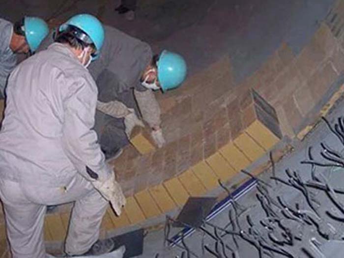 受到的是壓、拉、扭、剪的綜合機(jī)械應(yīng)力。窯的轉(zhuǎn)動(dòng),筒體橢圓度,襯磚和筒體之間及磚與磚之間的擠壓、扭動(dòng)、窯筒體變形,都會(huì)在磚襯之間產(chǎn)生機(jī)械應(yīng)力。當(dāng)筒體與輪帶間隙較大,使窯筒體橢圓度增大,襯磚受交變應(yīng)力增加,輪帶部位所受的機(jī)械應(yīng)力更為嚴(yán)重。我廠在更新磚后曾發(fā)生窯筒體彎曲,劇烈振動(dòng)加上窯襯時(shí)有局部過熱,引起胴體變形擠壓內(nèi)襯,再之托輪調(diào)整費(fèi)時(shí)較長,在距窯前6m整三號(hào)輪帶處發(fā)生紅窯,耐火磚在一個(gè)部位大面積脫落,挖補(bǔ),托輪調(diào)整正常窯體不再振動(dòng),此次之后再未發(fā)生紅窯現(xiàn)象。