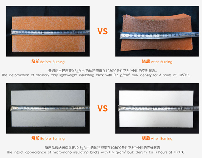 將體積密度0.6 g/cm3的普通粘土質(zhì)輕質(zhì)保溫磚和體積密度0.5 g/cm3的微納米保溫磚同時在1050℃下保溫3小時燒后,普通粘土質(zhì)輕質(zhì)保溫磚由230mm收縮到190mm,磚體嚴(yán)重變形,而新型保溫磚尺寸未發(fā)生變化,外觀完好。
